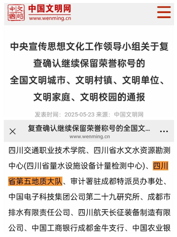 5月23日,四川省第五地质大队顺利通过复查,继续保留“全国文明单位”荣誉称号。