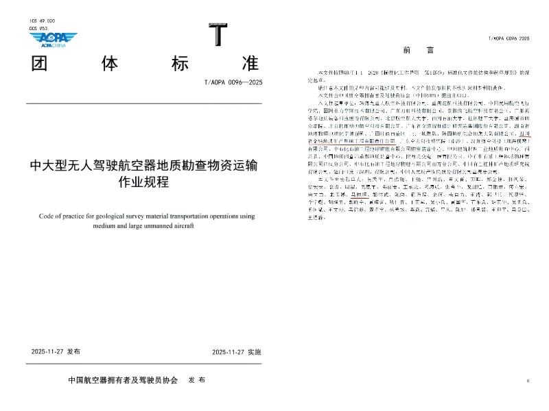 2025年11月27日,中国航空器拥有者及驾驶员协会正式发布《中大型无人驾驶航空器地质勘查物资运输作业规程》(标准号T/AOPA 0096-2025)。这是继今年2月《地下空间水平定向钻探技术规程》后,三大队金钻公司参与编制的又一项团体标准。