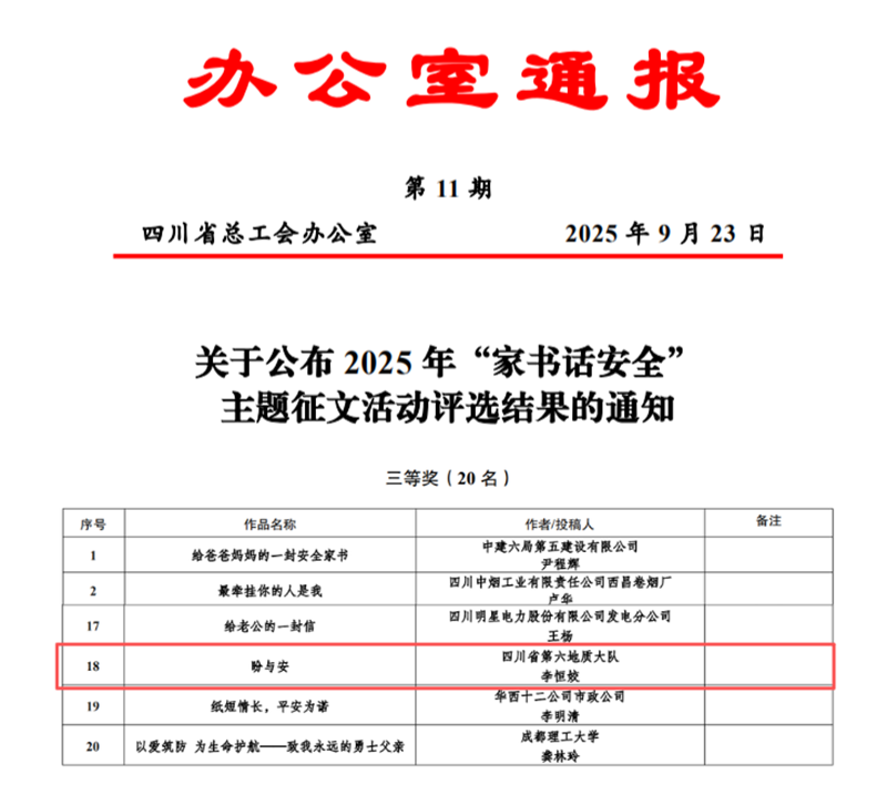 9月23日,由四川省总工会举办的2025年“家书话安全”主题征文活动结果揭晓。经组织专家评审,共评出一等奖 5 名,二等奖 10 名,三等奖 20 名,优秀奖30 名。六大队职工李恒姣撰写的作品《盼与安》在全省众多参赛作品中脱颖而出,荣获三等奖。