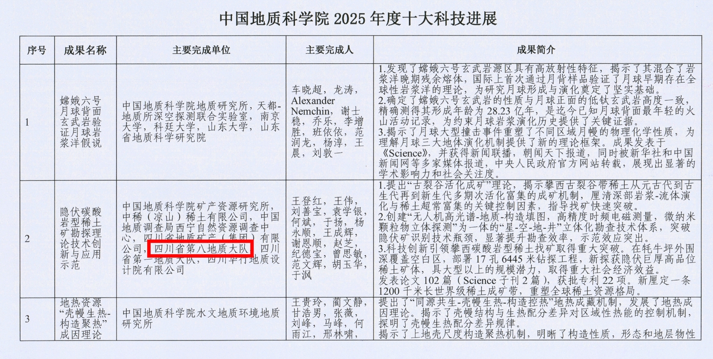 近日,中国地质科学院发布“2025年度十大科技进展”,八大队深度参与完成的攀西地区“隐伏碳酸岩型稀土矿勘探理论技术创新与应用示范”成果成功入选。