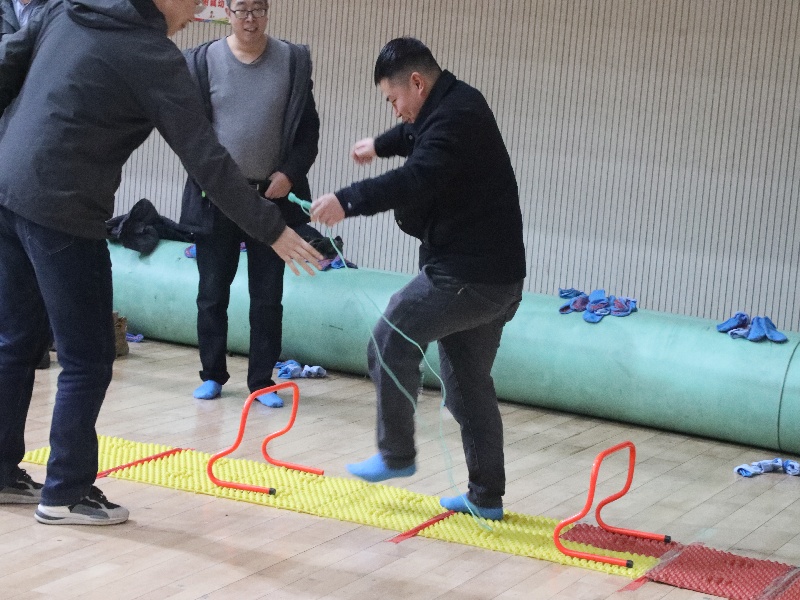 第三篇章“勇攀高峰”挑战体能极限。“瑞气迎门”要求参与者在限定范围内稳健踏步,寓意脚踏实地、步步高升;“步步高升闯大关”指压板接力赛,队员们克服困难,深刻体验“痛并快乐着”,象征新的一年攻坚克难、终达顶峰的决心。