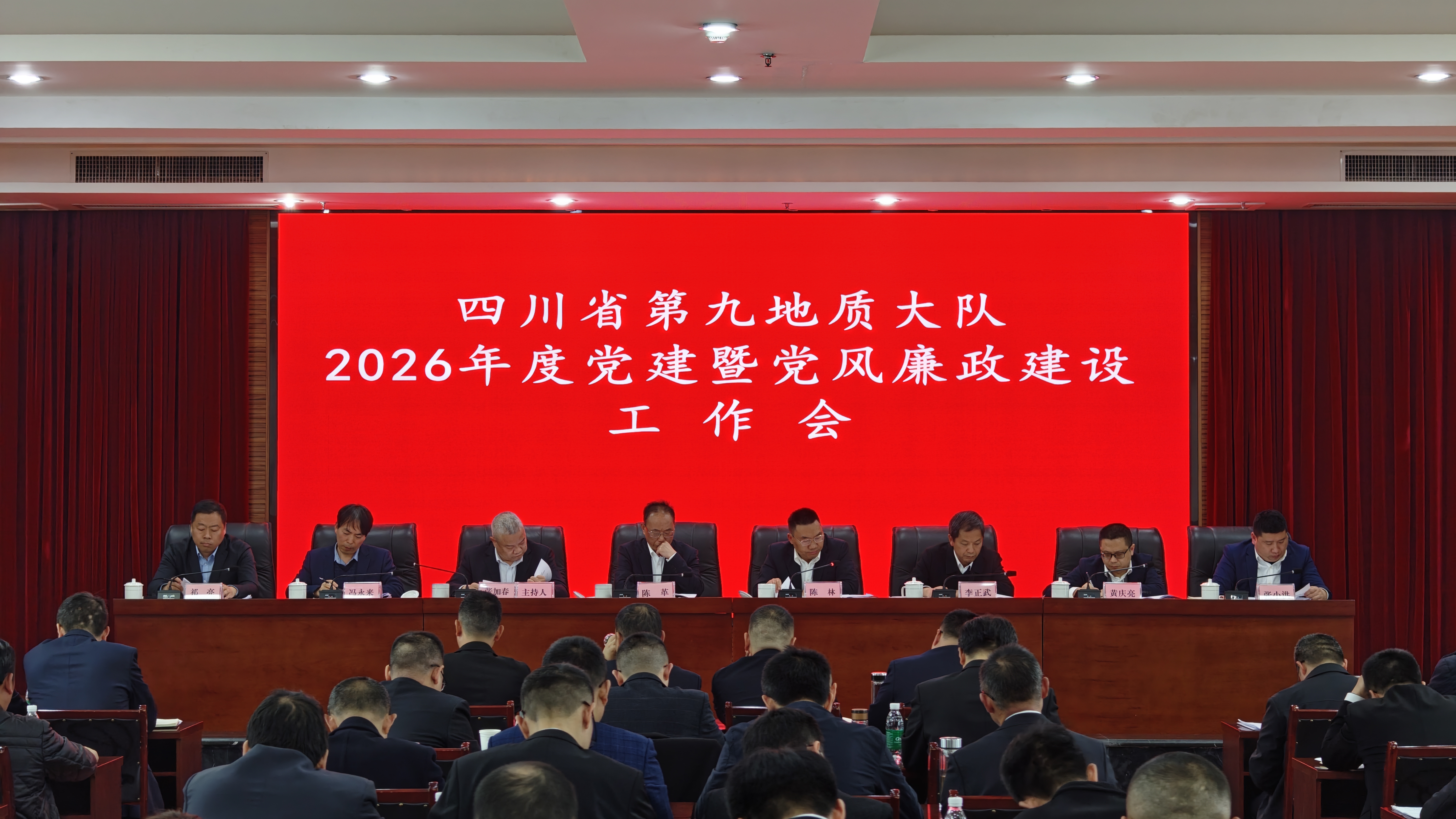 2月28日,四川省第九地质大队召开2026年党建暨党风廉政建设工作会。党委书记、副队长陈林以《坚定不移推进全面从严治党 以高质量党建引领大队地质事业高质量发展》为题作党建暨党风廉政建设工作报告。队长、党委副书记陈革及大队其他班子成员参加会议,纪委书记张加春主持会议。