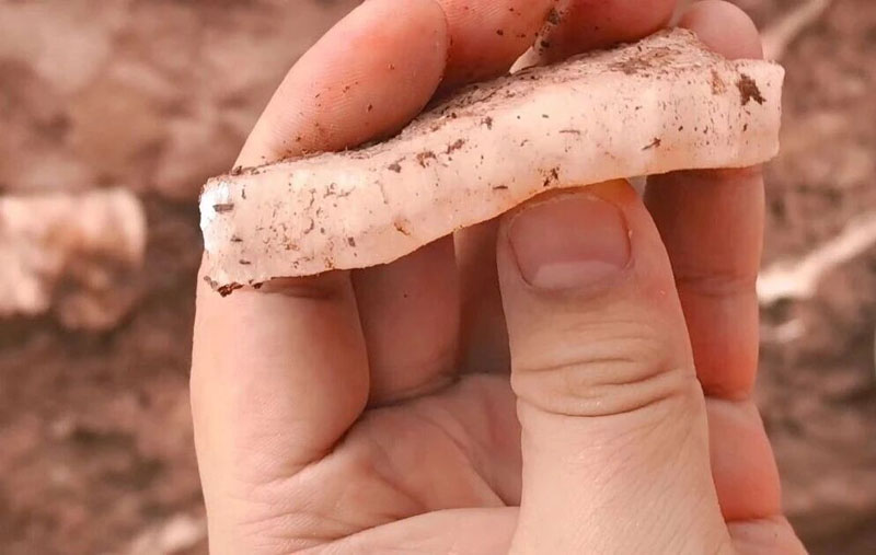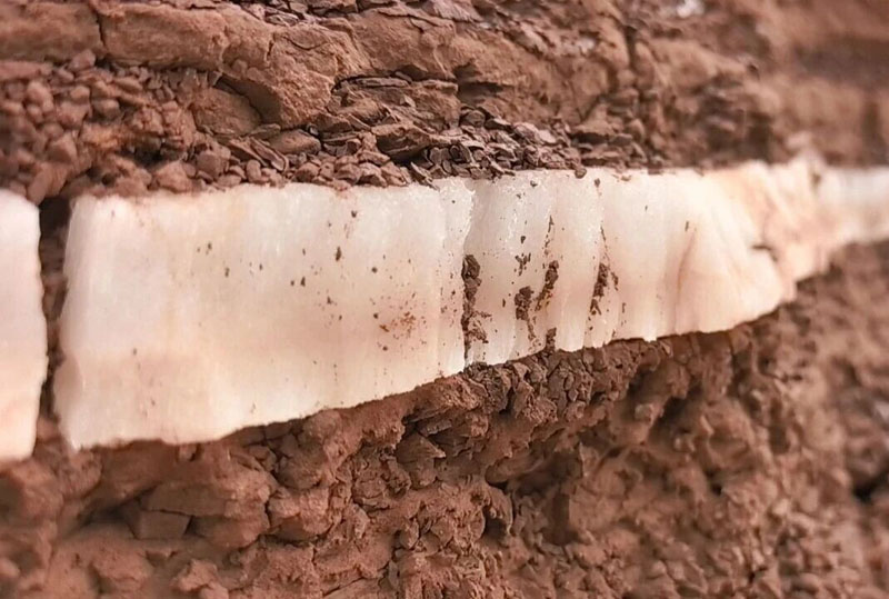 李佐强表示,该处沉积地层属于上白垩统灌口组,通过“玉石”的产出环境、形态以及颜色特征,并结合硬度和与稀盐酸反应综合判断,该白色“玉石”为石膏。