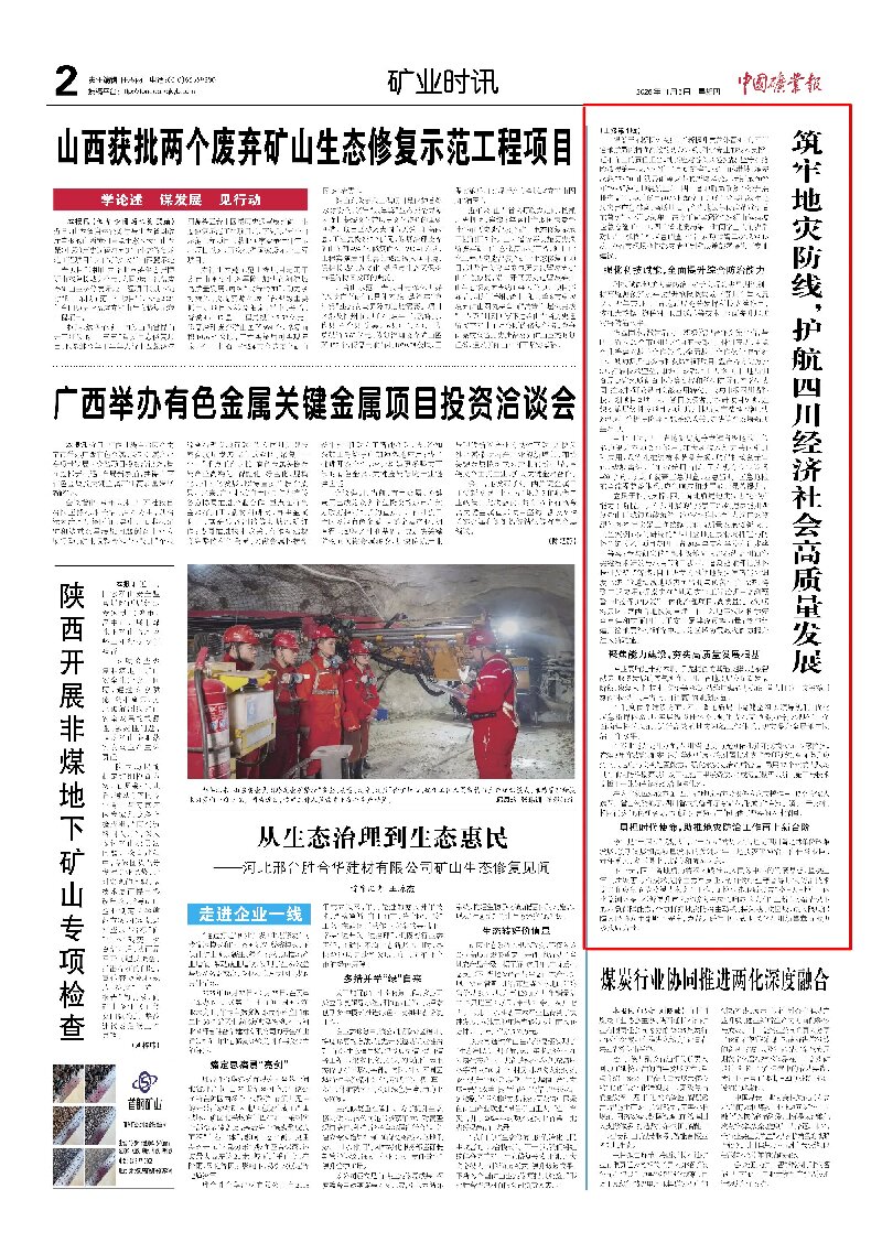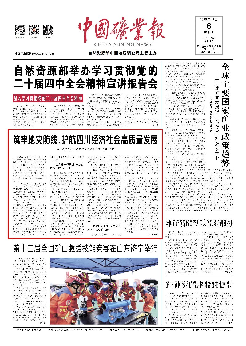 11月6日,《中国矿业报》头版刊发省地质局党委书记、局长伍定关于地灾防治专题文章《筑牢地灾防线,护航四川经济社会高质量发展》。文章指出,今年是“十四五”规划收官、“十五五”蓄势之年,也是四川省地勘单位改革发展、创新发展和高质量发展的关键之年。地质灾害防治工作任务艰巨、责任重大,容不得半点懈怠和疏忽大意。四川省地质局将深入践行以人民为中心的发展思想,坚决扛牢地质灾害防治技术支撑主力军责任,全面做好驻守督导地灾防治技术支撑和应急抢险救援技术支撑工作,加快构建地质灾害“空-天-地”一体化监测体系,不断提升重大地质灾害应急响应能力和“三断”极端情况下的应急保障能力,全力打好地灾防治主动战、持久战、攻坚战,最大限度保障人民群众生命财产安全,为奋力谱写中国式现代化四川新篇章贡献更多地质力量。