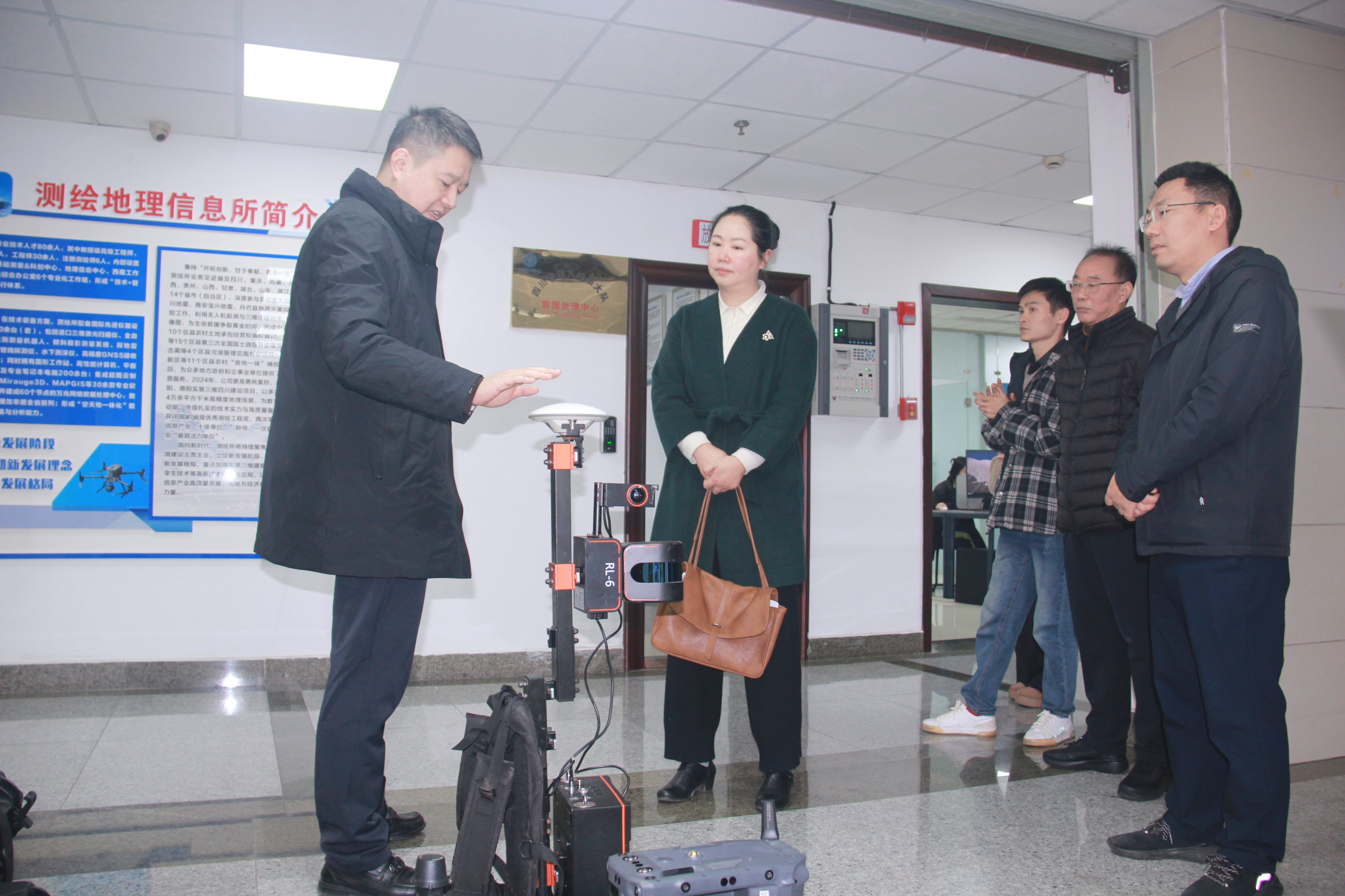 冷静实地调研了九大队办公环境,并深入队属测绘地理信息所,参观了地理信息数据处理中心、地理信息与地质环境德阳市重点实验室,并详细了解了相关科创平台在时空信息应用、自然资源监测、遥感解译分析等领域的研究进展与成果转化情况。