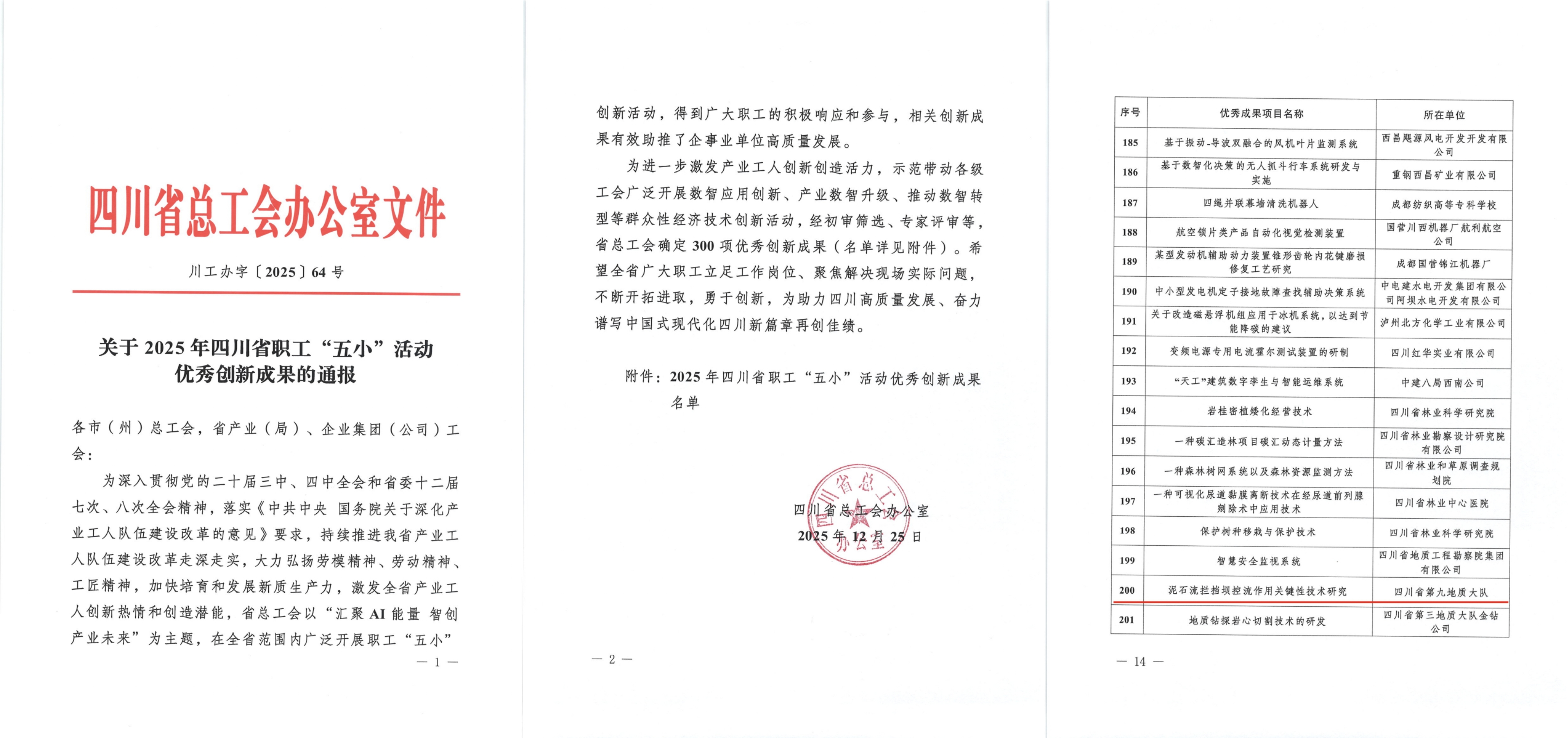 近日,四川省第九地质大队推动的创新工作接连传来喜讯,祁亮时空信息创新工作室成功获批命名、邵昌盛物探创新工作室年度考核优秀、大队地灾防治所“泥石流拦挡坝控流作用关键性技术研究”项目获评省级优秀创新成果,三项成果集中凸显了大队在创新平台建设、团队培育和技术攻关领域的扎实成效,为四川地质事业高质量发展注入强劲动力。