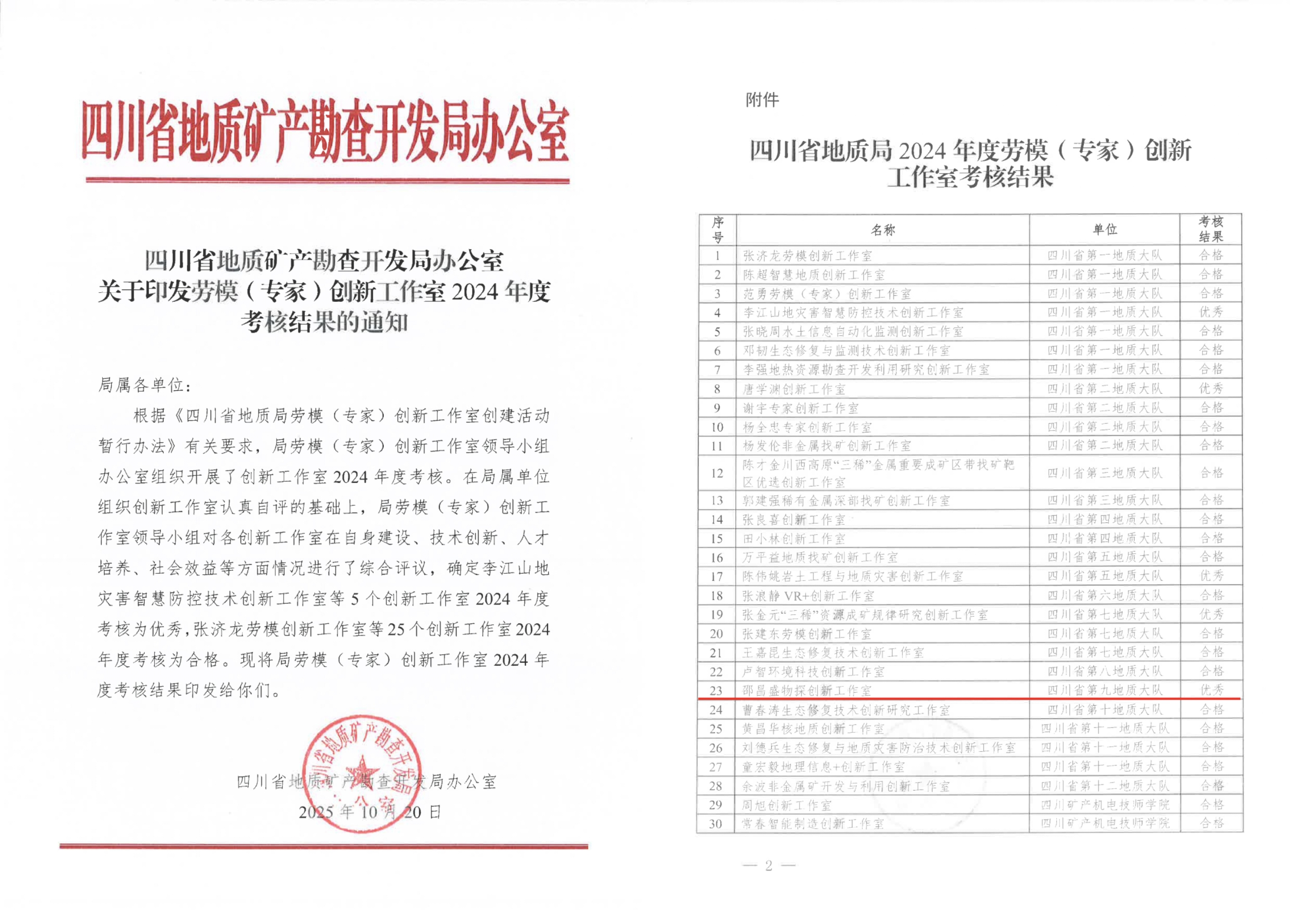 在创新平台搭建方面,大队精准对接四川省地质矿产勘查开发局关于劳模(专家)创新工作室建设的要求,积极组织开展申报培育工作。其中,祁亮时空信息创新工作室凭借明确的创新方向、扎实的团队基础和清晰的发展规划,成功通过局属单位申报推荐、资格审核、现场考察等多环节评审,被命名为第四批局劳模(专家)创新工作室。该工作室的获批,将进一步整合大队时空信息领域创新资源,聚焦相关技术攻关与人才培养,为地质工作数字化、智能化转型提供有力支撑。